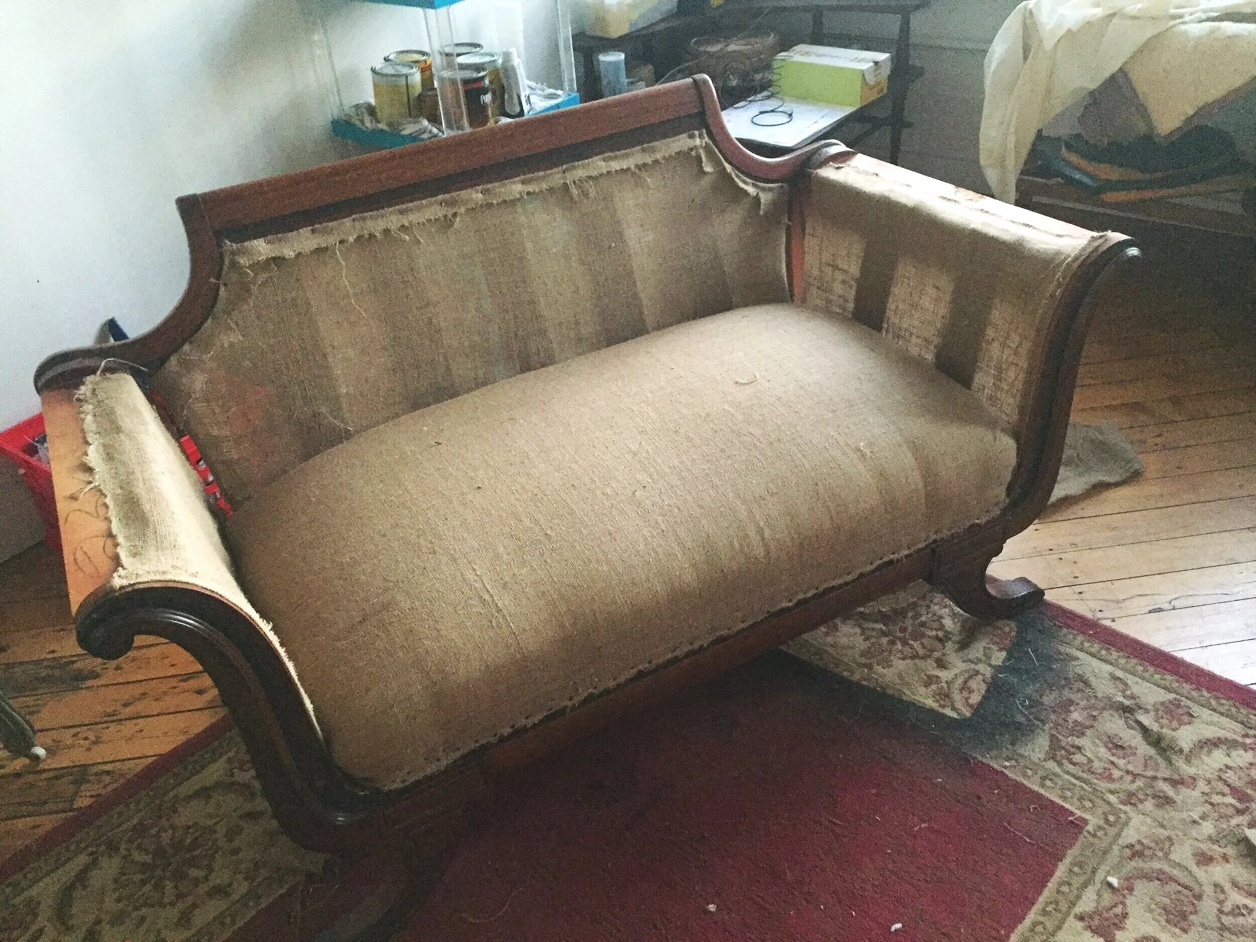 Vintage sofa, stripped to it’s bones, wood refinished and re-stuffed. Pre-upholstered ready for client fabric choice.